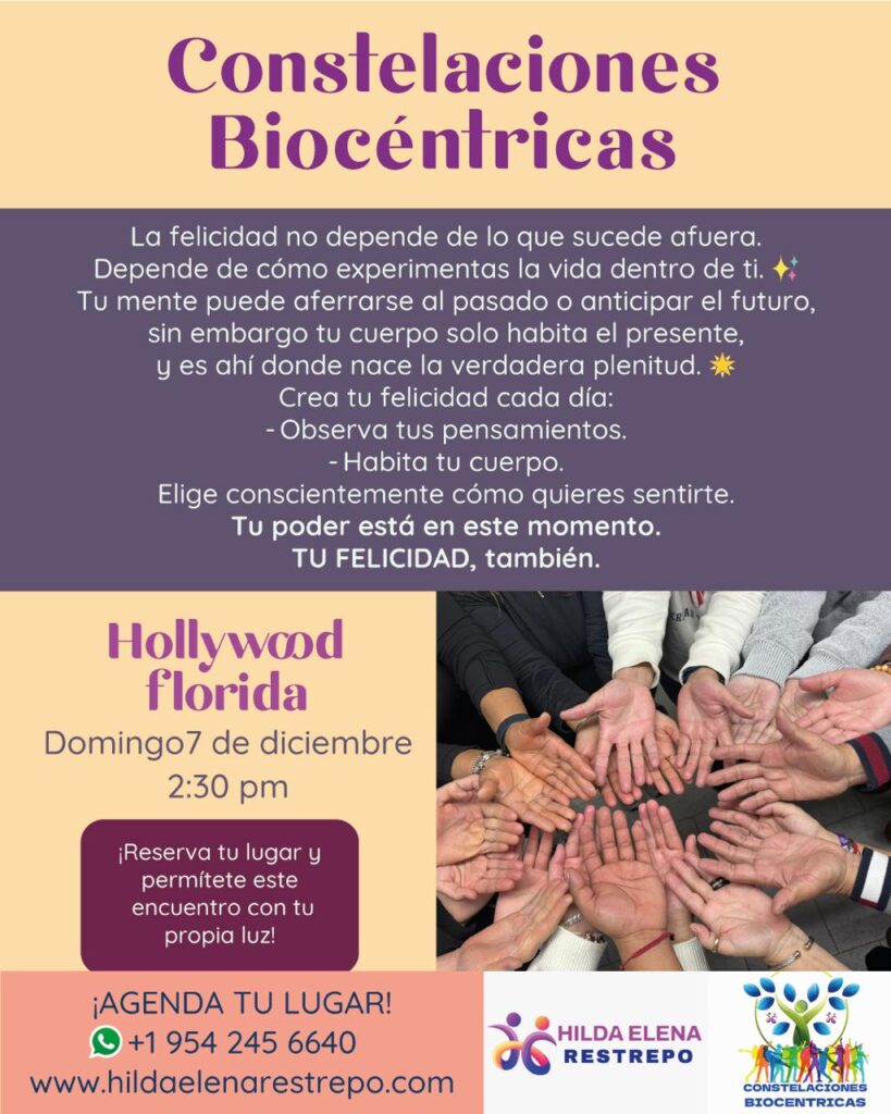 ✨ Cuando decides tomarte en el presente al permitirte transformaciones y asentir a la vida. Este 7 de diciembre te invito a un encuentro profundo contigo mism@ a través de las Constelaciones Biocéntricas en Hollywood, Florida. Reserva tu lugar y dale espacio a tu luz interior.