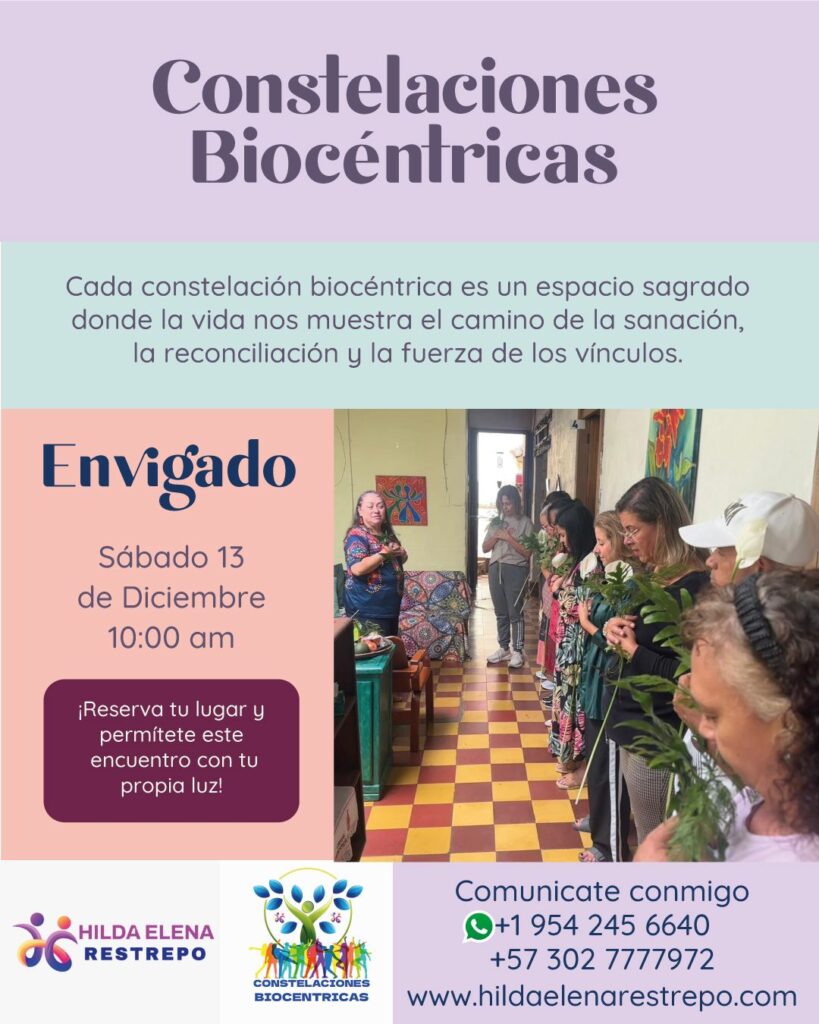 Este 13 de diciembre a las 10:00 a.m. nos encontraremos en Ser Abierto, Envigado, para vivir una Constelación Biocéntrica: un espacio sagrado donde la vida nos impulsa hacia la reconciliación y la fuerza de nuestro árbol genealógico potenciando transformaciones trasgrnetacionales y actuales.